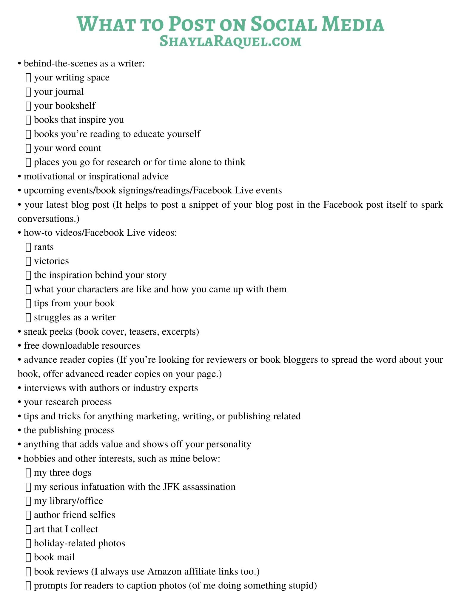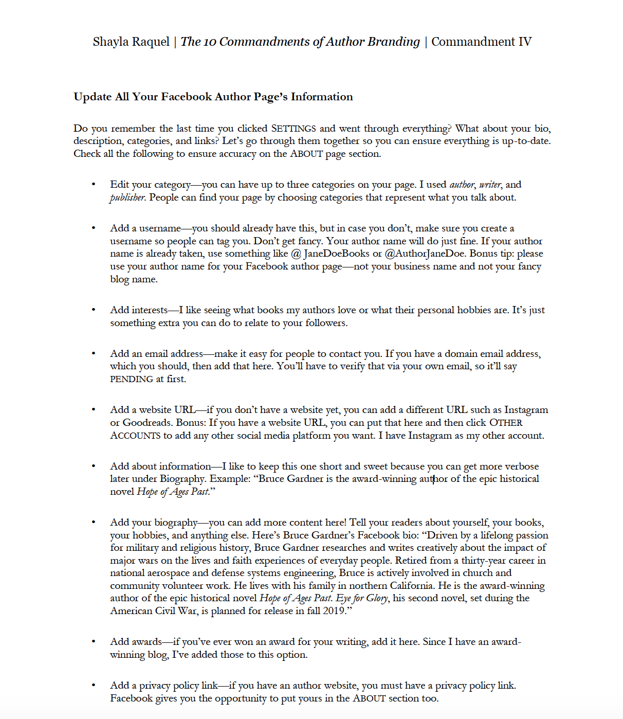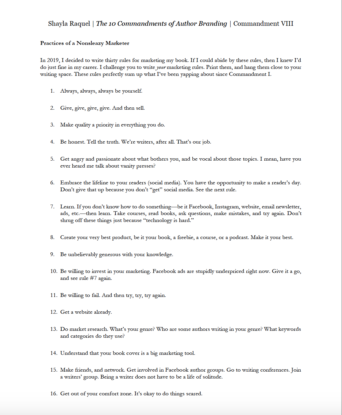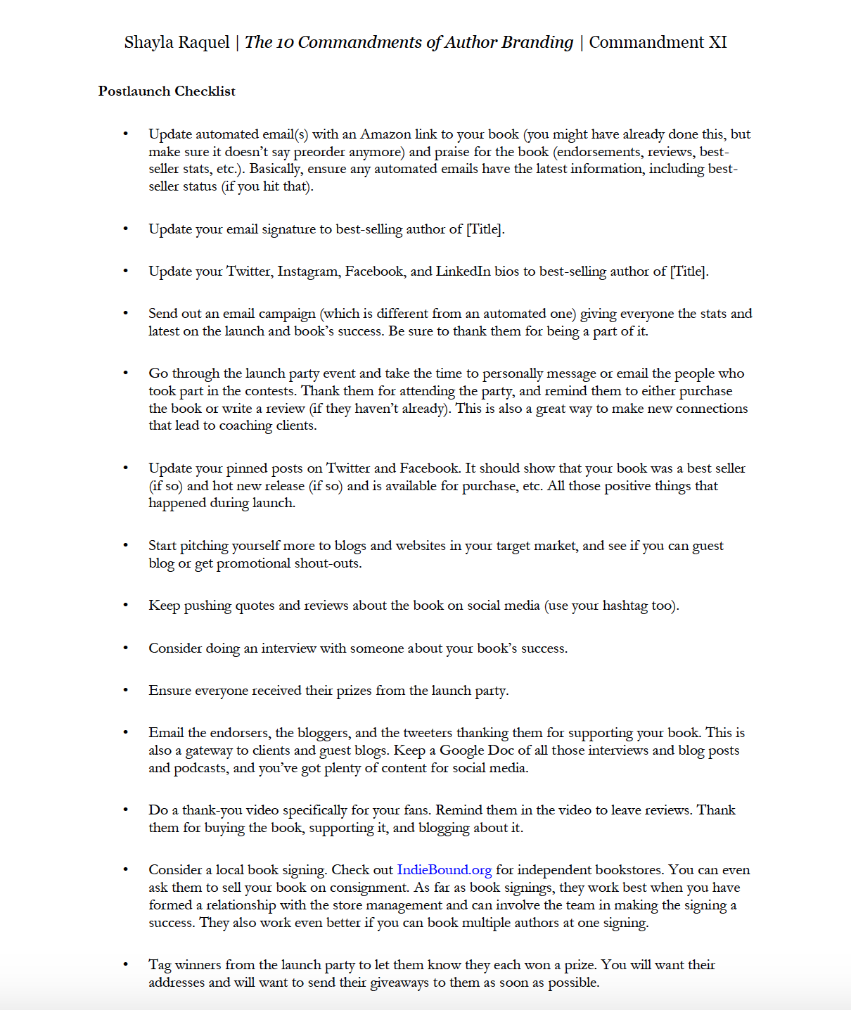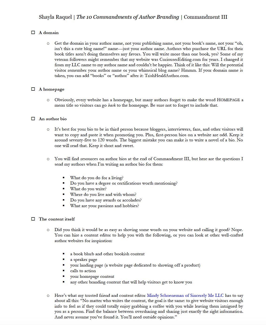 Commandment III discusses the importance of a mobile-friendly, authentic website. From that chapter, I’ve turned the first couple of pages into a printable PDF to help you ensure you have everything on your author website.