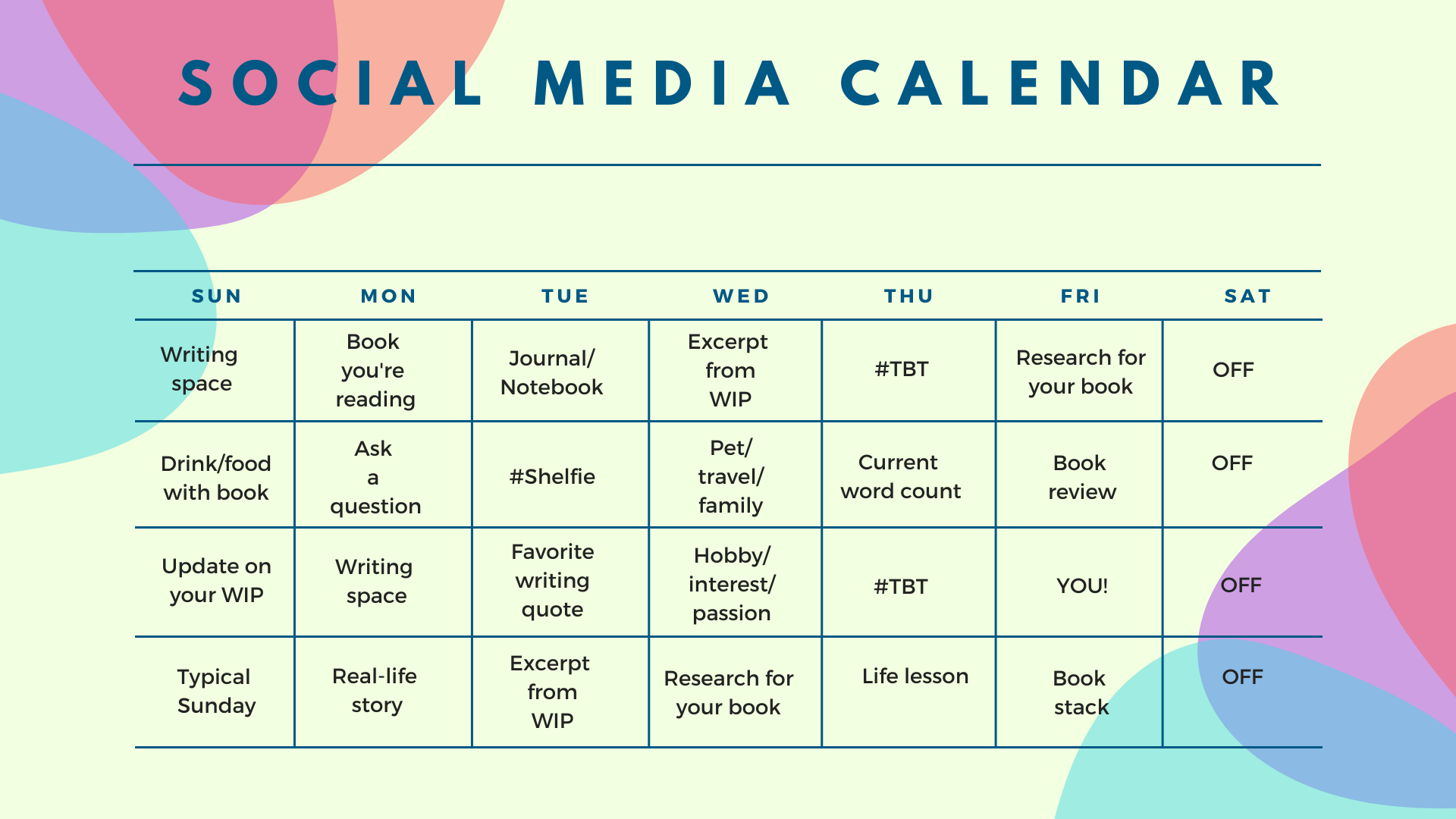 New to this social media thing? Print my calendar to keep you on track with ideas for posts and photos.